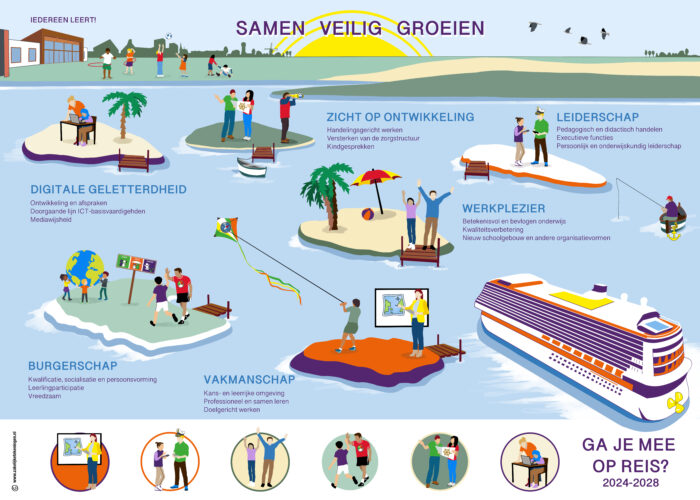 Maak het schoolplan zichtbaar voor de leerlingen, ouders, het team en het bestuur. Een visueel schoolplan helpt om het plan ‘actief’ te houden. Hang het visuele plan als poster in school en zet ‘m als klikbare pdf op de website. Er is van alles mogelijk.